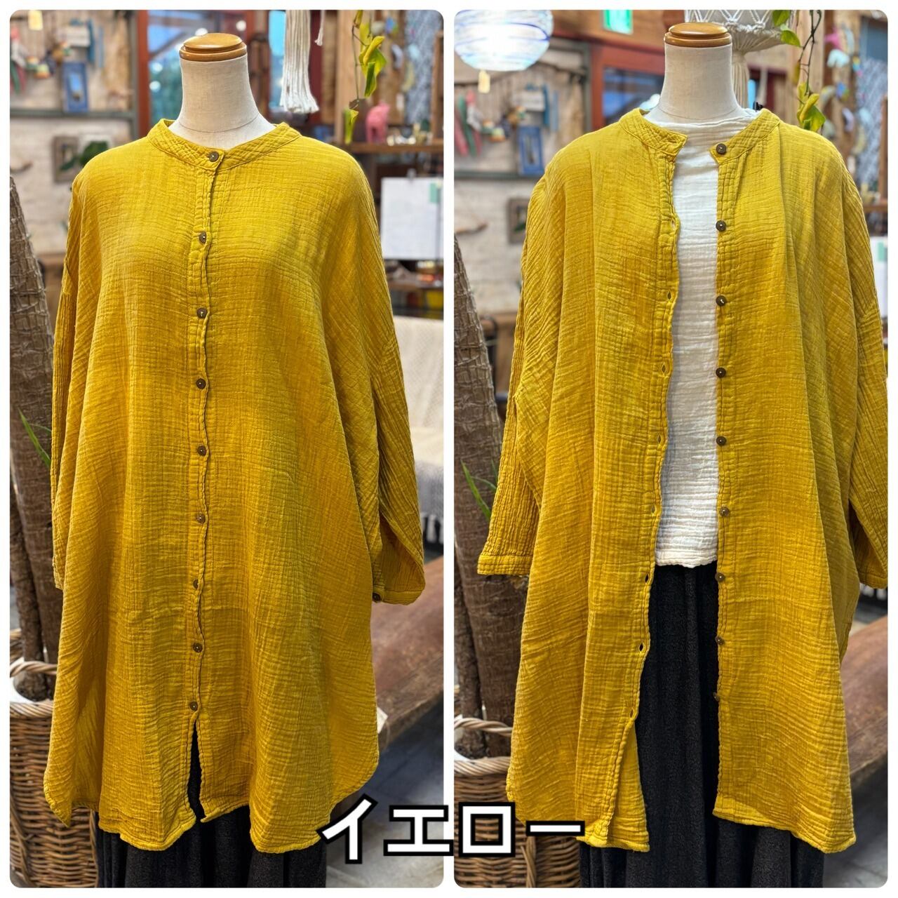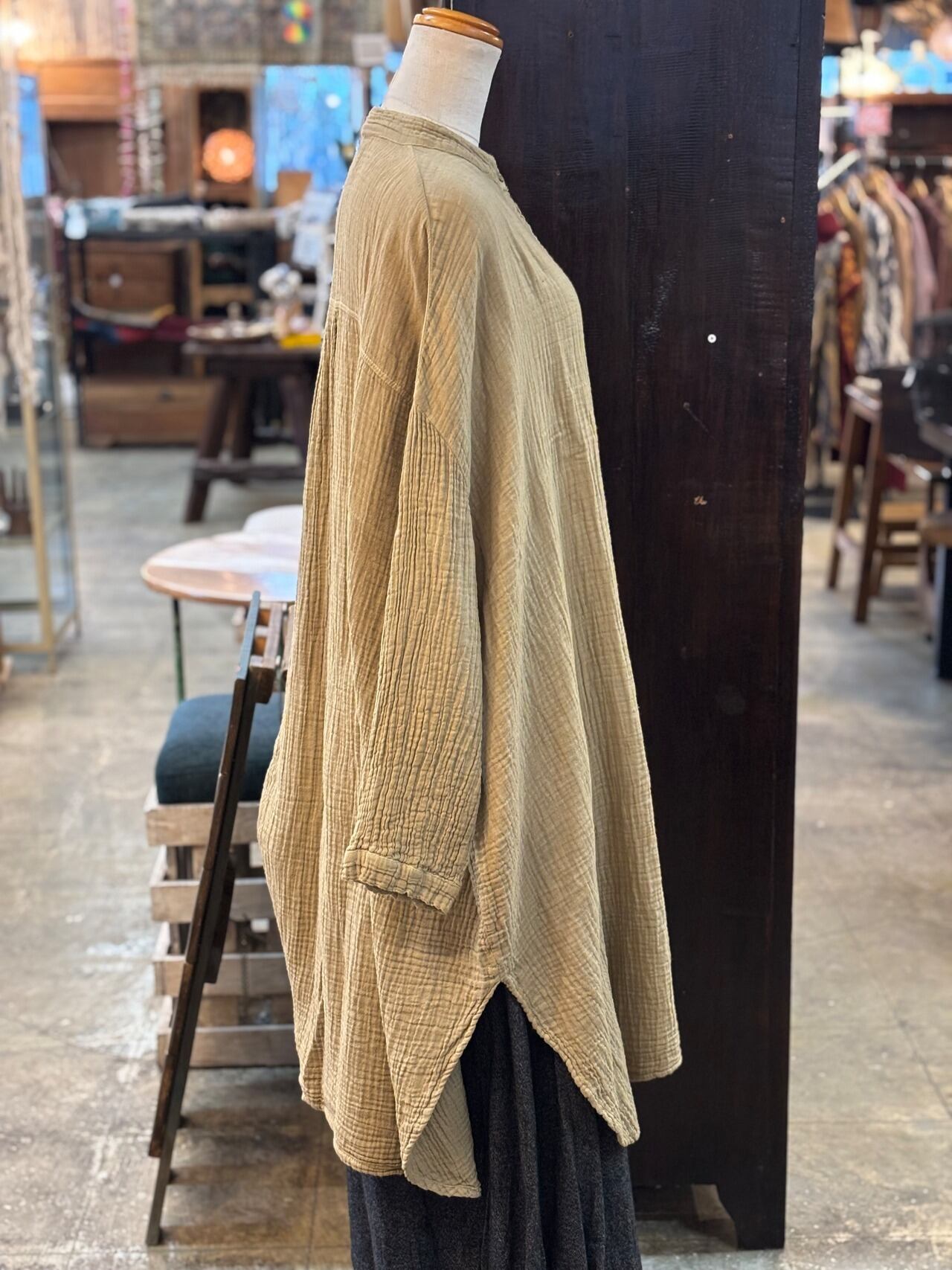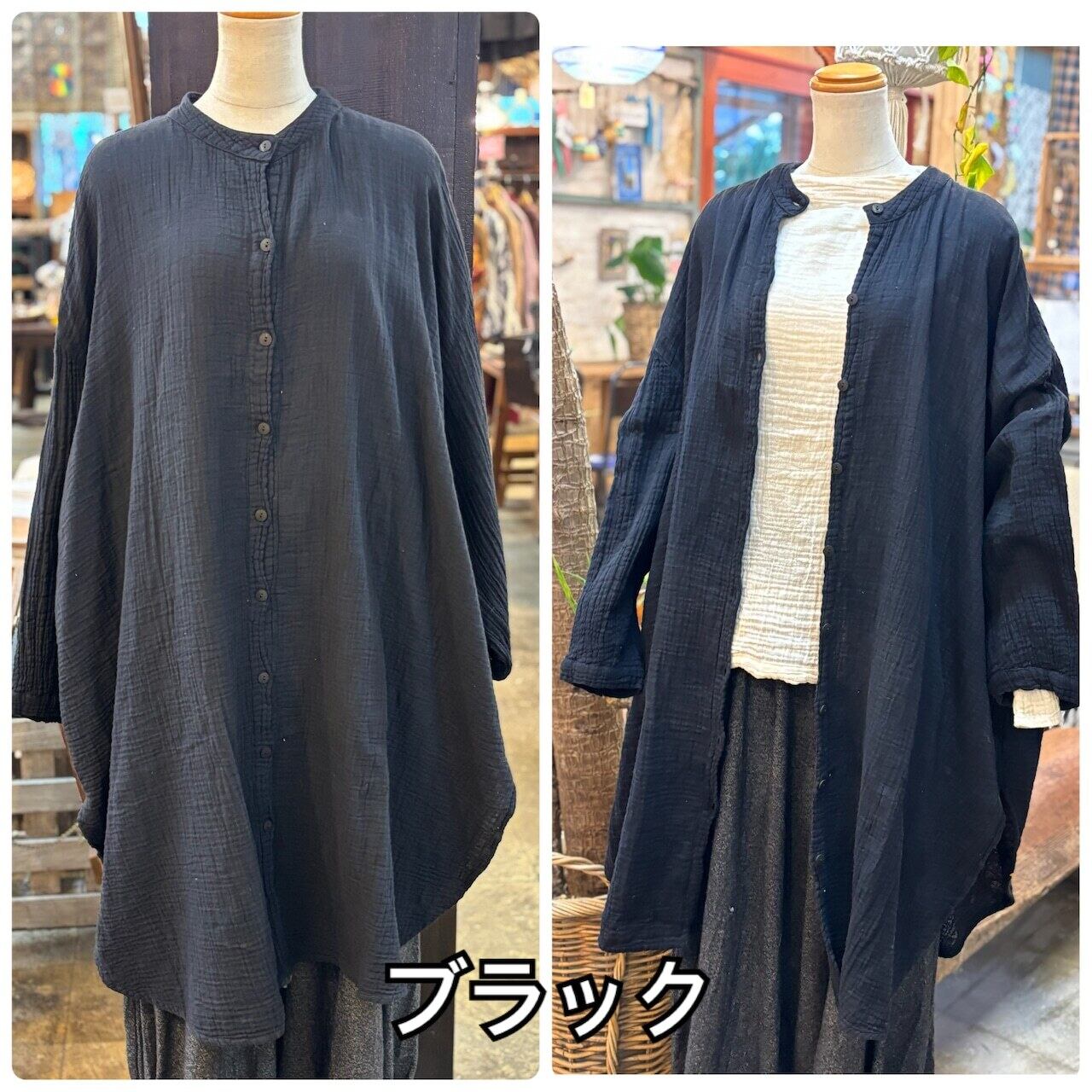 ダブルガーゼ バンドカラー シャツワンピース レディース トップス コットン100% cotton 綿 ガーゼ ハイネック 長袖 コットン 部屋着 綿 ドルマン